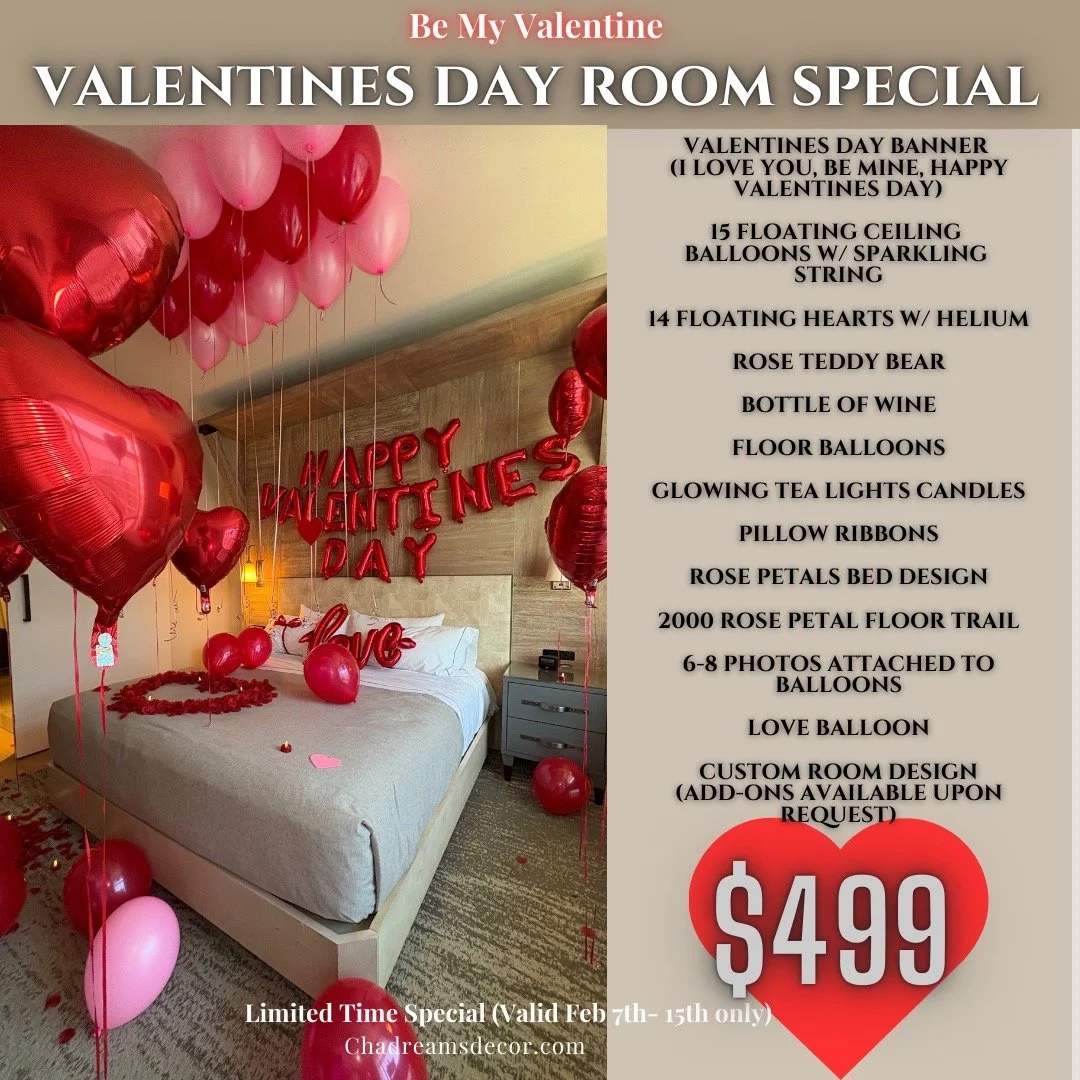 Take your hotel room to the next level with the DREAM Deluxe package. We decorate the room with balloons, flowers, candles and more. At the end of the night , the goodies are yours to keep.
